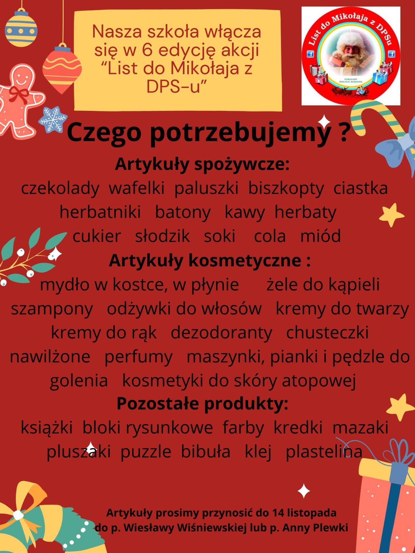 W tym roku nasza szkoła włącza się w 6 edycję akcji "List do Mikołaja z DPS-u", polega ona na podarowaniu produktów, które w okresie świątecznym trafią do mieszkańców łódzkich domów pomocy społecznej.